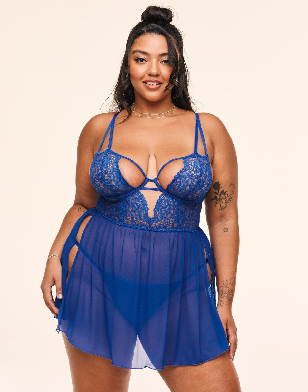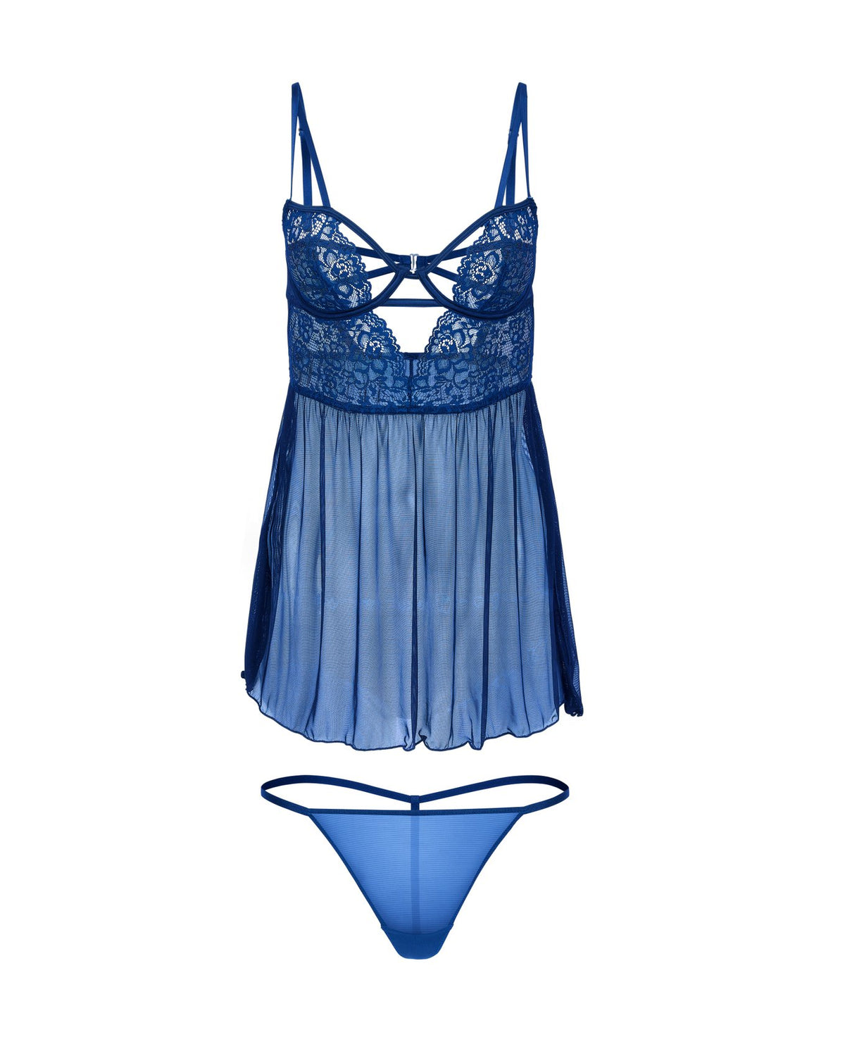This babydoll is perfect for a night of passion, featuring lace plunge cups and a lacy cut-out cage-effect. The set...